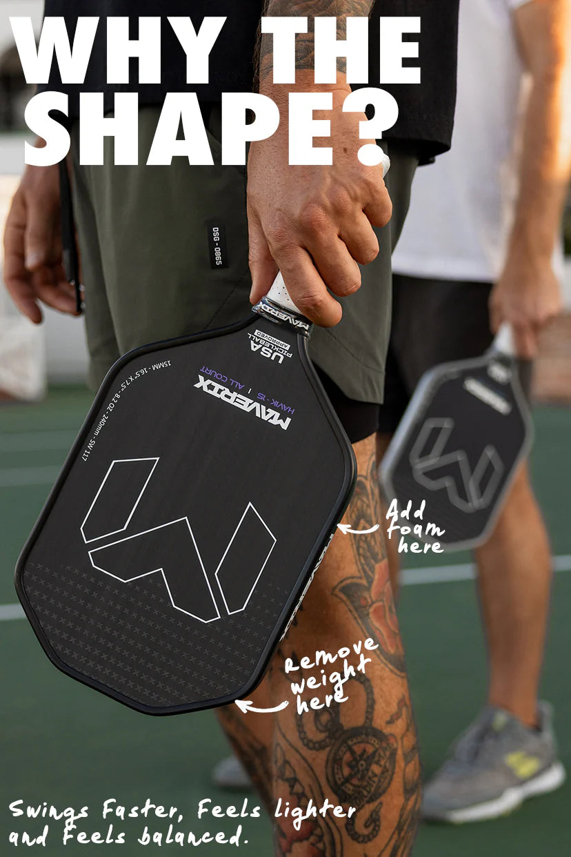 Designed for players who want it all — control, power, and fast hands — this innovative 15mm paddle features a unique shape that shifts weight closer to your hand for quicker swings and improved maneuverability. The result? A paddle that feels light, plays fast, and still delivers serious pop.