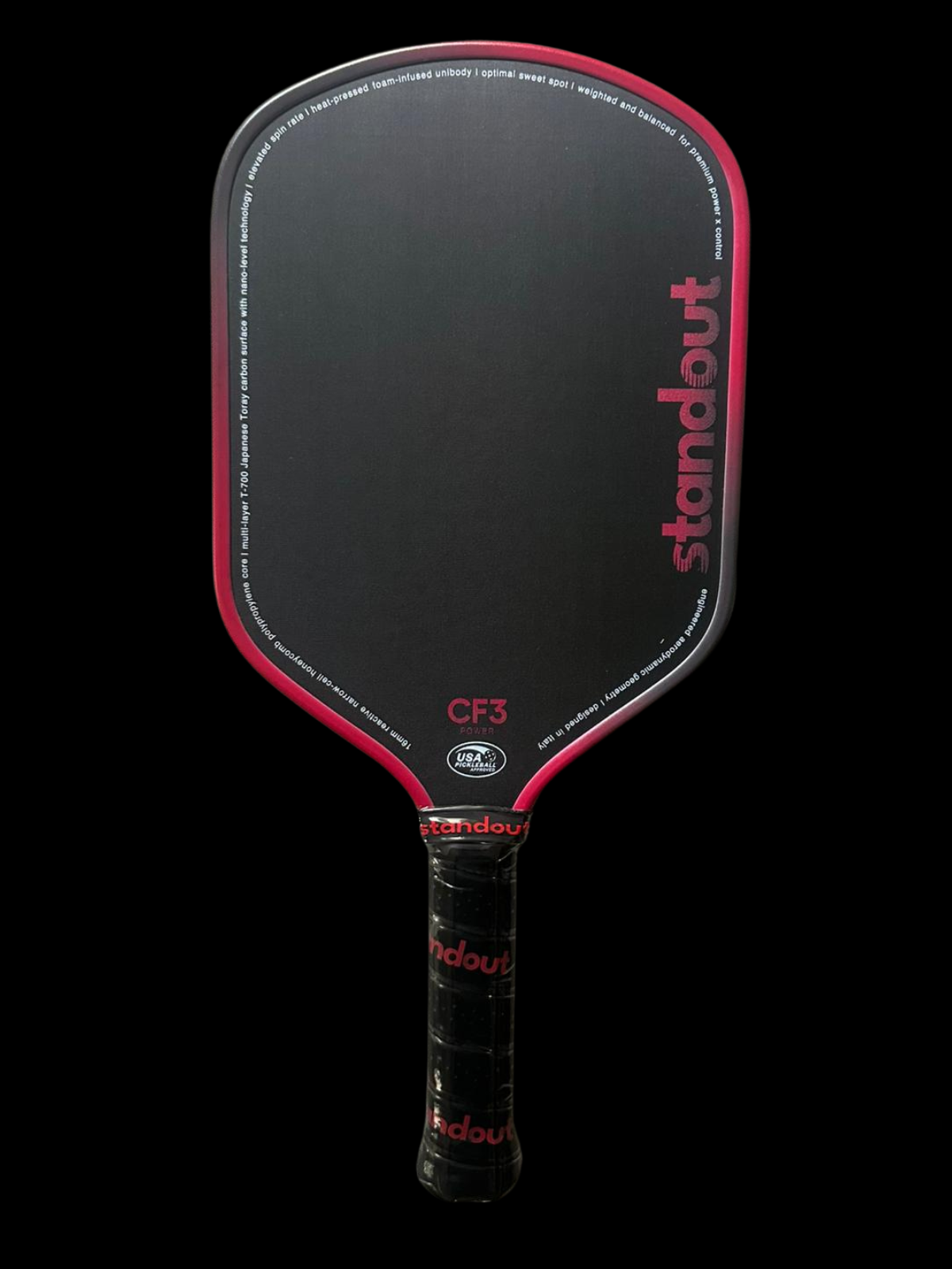Unleash explosive power with the Standout CF3, engineered from premium Japanese T700 carbon fiber for unmatched pop, spin, and control. Trusted by pro MLP players, this 16mm paddle features a reactive small-cell core and head-weighted balance — perfect for hard-hitters who dominate with groundstrokes and smashes.